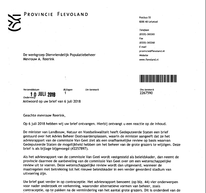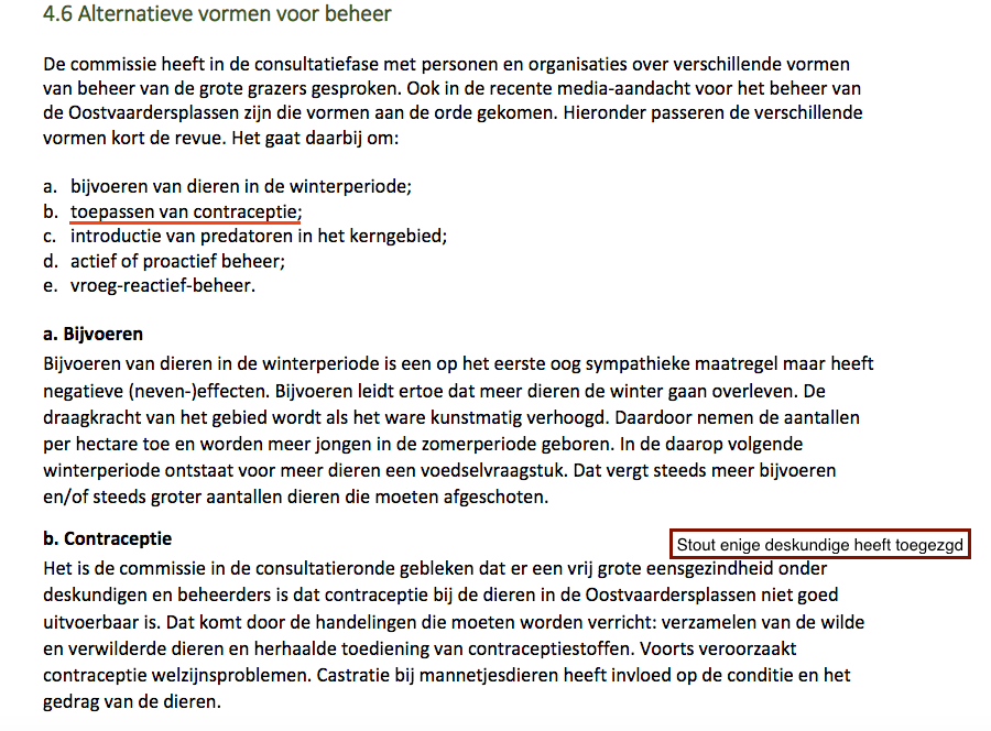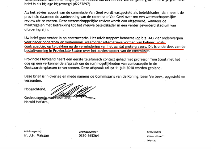 De werkgroep heeft in Externe begeleidingscommissie beheer Oostvaardersplassen gelezen dat gelezen dat er geen anticonceptie gebruikt kan worden. Terwijl professor Stout zegt dat anticonceptie mogelijk is vandaar dat wij zijn gaan inspreken ! De informatie is achterhaald en het antwoord op de brief is nooit gegeven door de heer van Geel zelf.