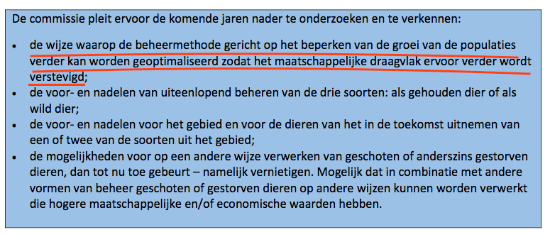 - In de brief van de minister 28286 Dierenwelzijn 2019, ‘onderdeel van het beleidskader is ook het advies om nadat de populatie in aantal is teruggebracht de tijd te nemen te verkennen welke beheermaatregelen het welzijn van de dieren kunnen optimaliseren…’