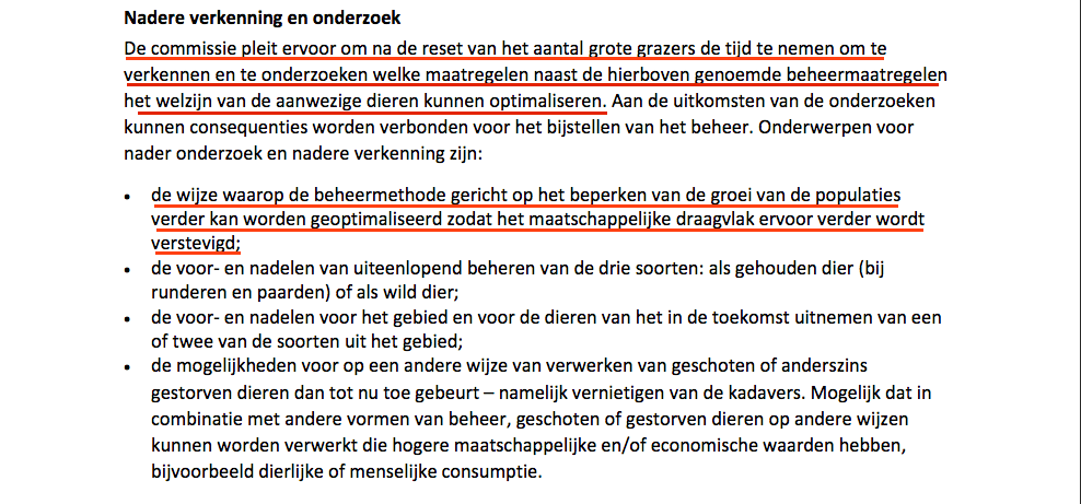 De commissie pleit ervoor om na de reset van het aantal grote grazers de tijd te nemen om te verkennen en te onderzoeken welke maatregelen naast de hierboven genoemde beheermaatregelen het welzijn van de aanwezige dieren kunnen optimaliseren. Aan de uitkomsten van de onderzoeken kunnen consequenties worden verbonden voor het bijstellen van het beheer. Onderwerpen voor nader onderzoek en nadere verkenning zijn: