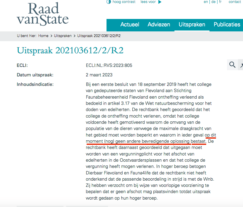 Jagen, afschieten, vangen en naar de slacht afvoeren of uit laten hongeren wat nu door de overheid wordt uitgevoerd is dus eigenlijk helemaal niet nodig. Het is de reden waarom Diervriendlijk Nederland en Reerink vanaf 2020 juridisch de strijd zijn aangegaan met een van de Natura 2000 parkbeheerders en wel: Provincie Flevoland. En op 24 januari 2024 een tweede rechtszaak tegen Flevoland zijn begonnen.