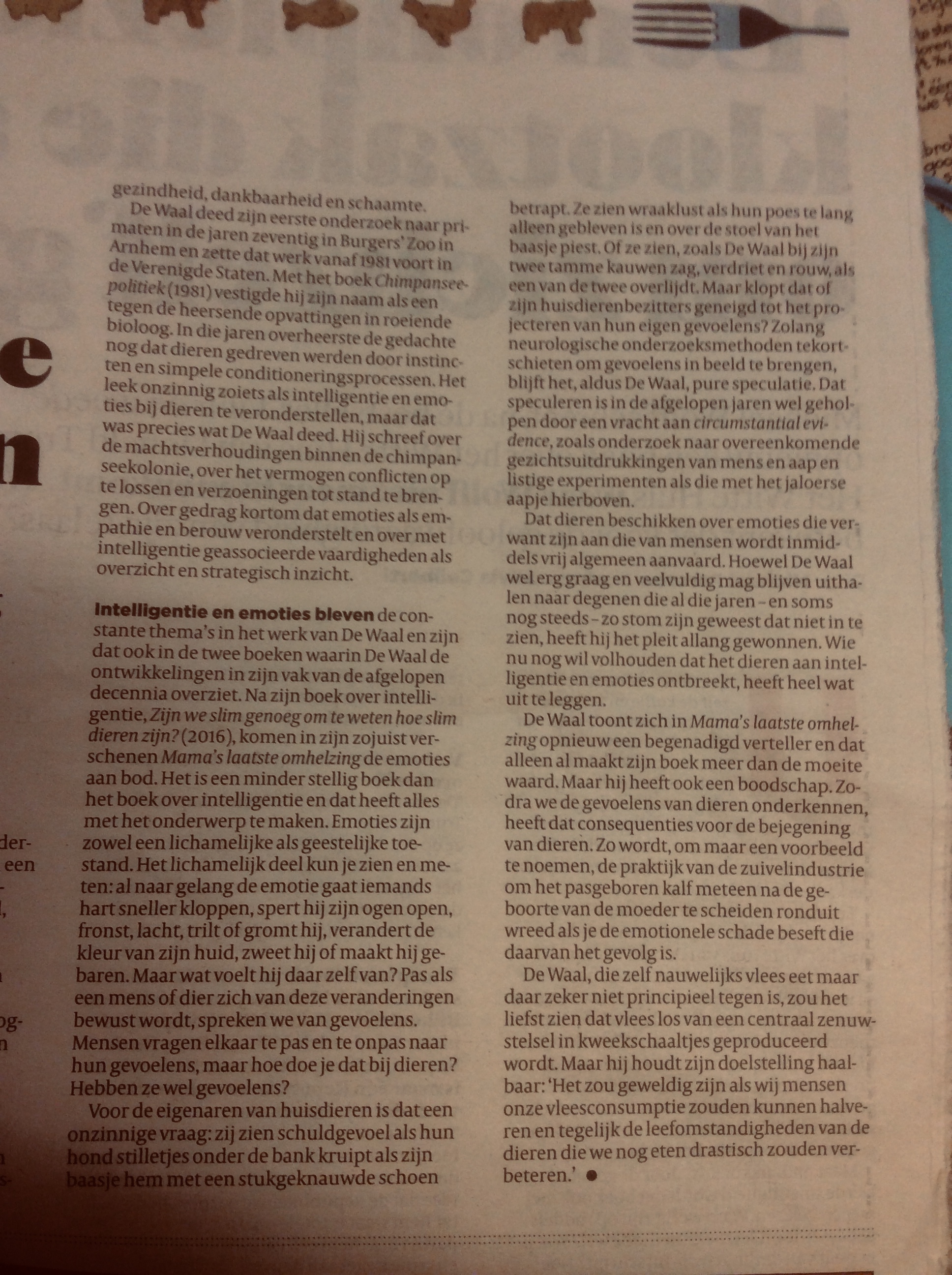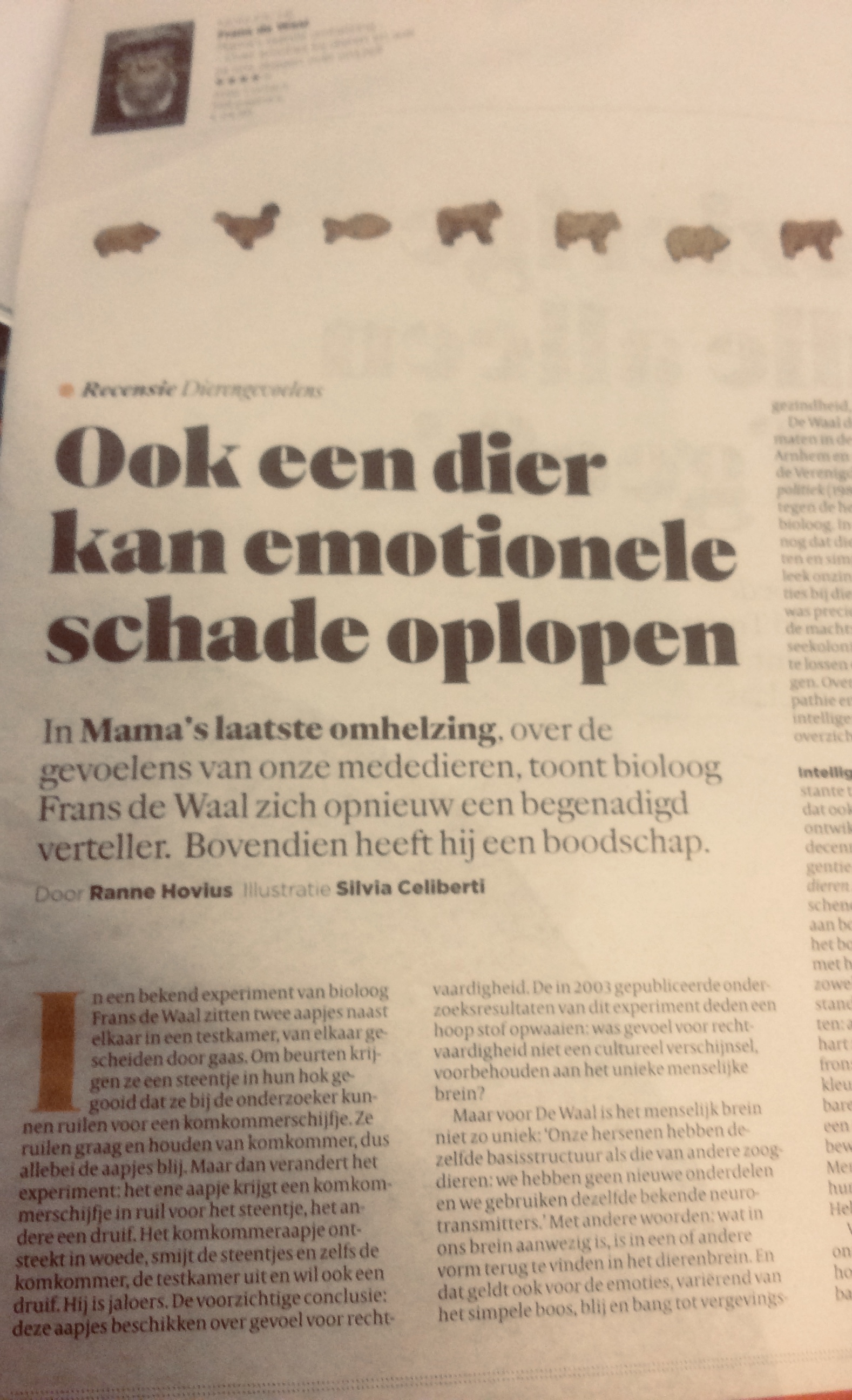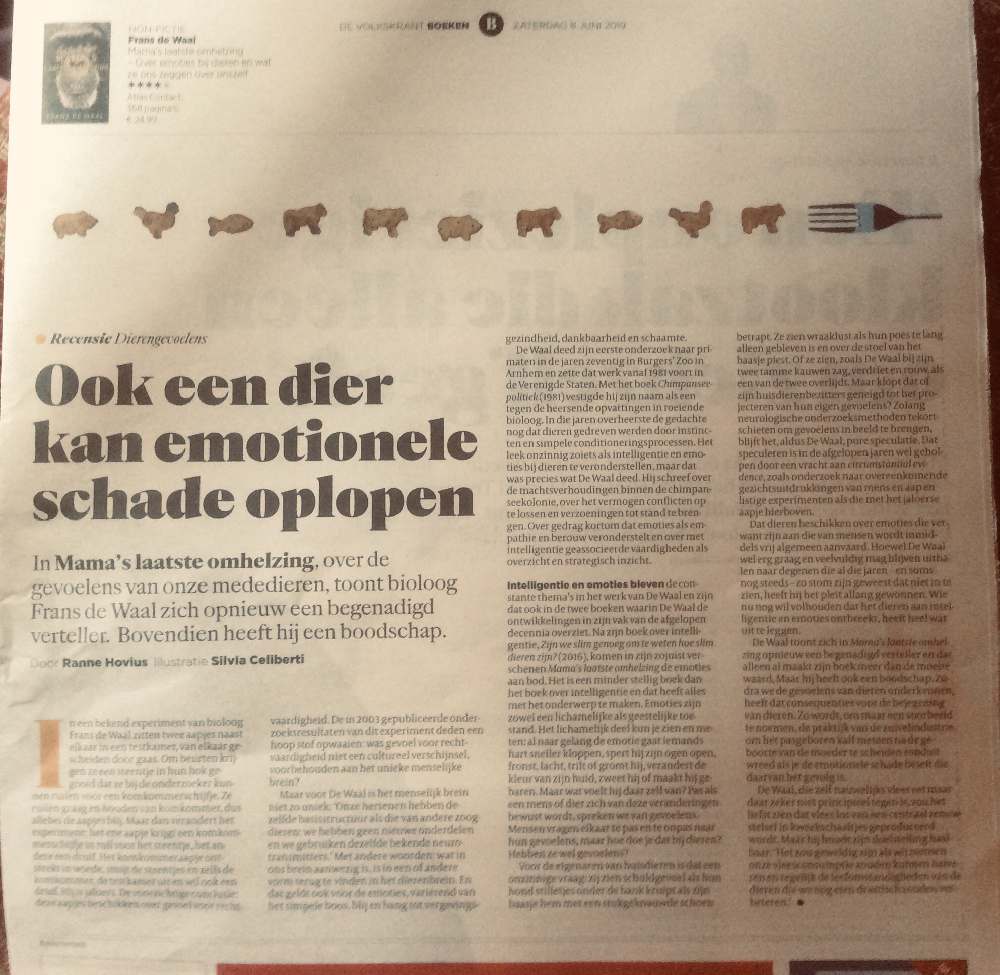 Frans de Waal is de grondlegger waar de dierenrecht-beweging op dit moment mee bezig is. Hij geeft een flinke zet naar hoe men naar dieren zou moeten kijken. Merendeel van de mensen ziet dieren als product. Frans de waal toont aan dat het net als wij wezens zijn met emoties. Uiteraard kan je dat dagelijks ervaren als je met dieren samenleeft. Als je de mogelijkheden in huis hebt open te staan voor wat ze ons vertellen willen. Dat wat Frans de hele dag bekijkt kan dus thuis ook ! Maar gelukkig heeft een wereldberoemde primatoloog dezelfde emoties bij dieren via wetenschappelijk onderzoek aangetoond. Daar zijn wij blij mee. Het is nodig de meeste mensen erop te wijze dat daar consequenties aan verbonden zijn. Het is nu ( 2019 ) en dit onderwerp nog steeds een gigantisch taboe. En dat is niet voor niets. Het is voor veel mensen die dieren eten, misbruiken, er geld aan verdienen, het als amusement zien, een zeer ongemakkelijke waarheid. Want de consequentie is een andere wereld. Voor de werkgroep een streven. Inzet : samenleven en empathie voor de ander dus verzorgen van de kwetsbare zijn ingrediënten waar we het eventueel nog mee gaan halen. De kern van de Jeremy Bentham comité waar de werkgroep onderdeel van is. Op deze site kunt u in de loop der tijd een verzameling van Frans de Waal zijn ontdekkingen vinden.De grondlegger van waarom wij voor dierenrecht strijden. Zaterdag 8 juni 2019 NRC