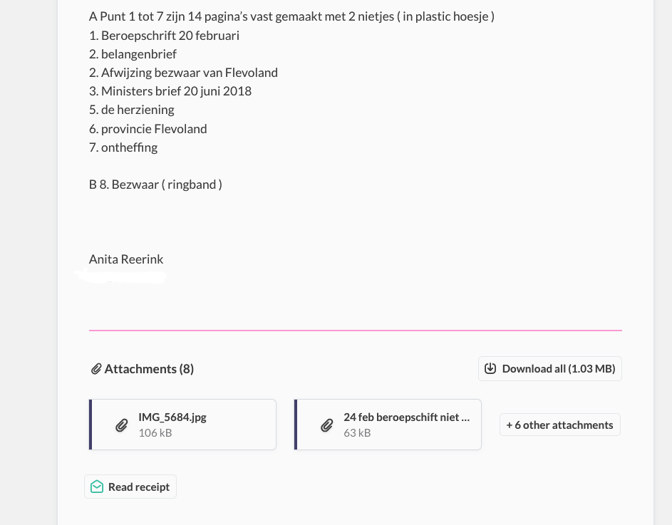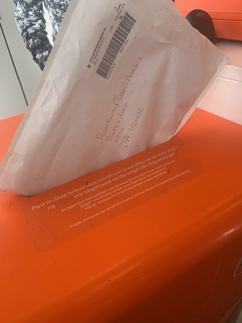 Bij aankomst kreeg Reerink in haar beroepschrift een stempel als bewijs van aankomst door de rechtbank gedaan. Voor registratie van dat bewijs heeft Reerink daar weer een foto van gemaakt.