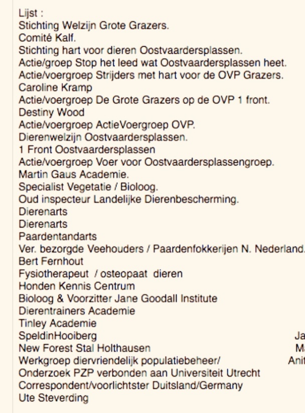 Dit zijn enkele groepen – mensen die in 2018 participeerde bij provincie Flevoland; opzoek naar humaan beheer. Omdat deze groepen / mensen tegen uithongeren en doodschieten zijn. De overheid strijdt nog steeds voor uithongeren en doodschieten. De overheid deed en doet er alles aan dat te behouden.