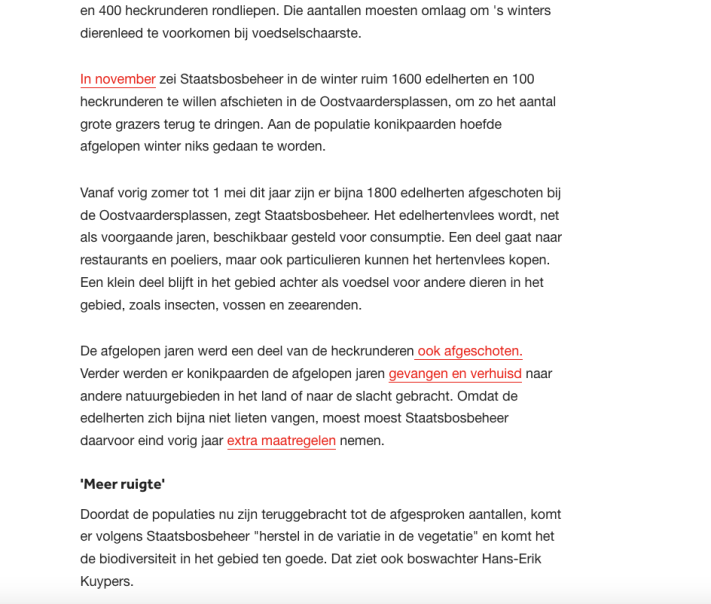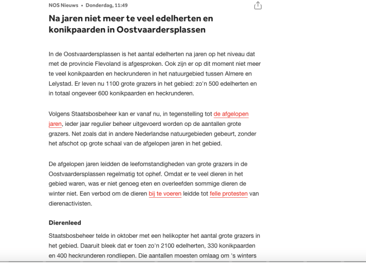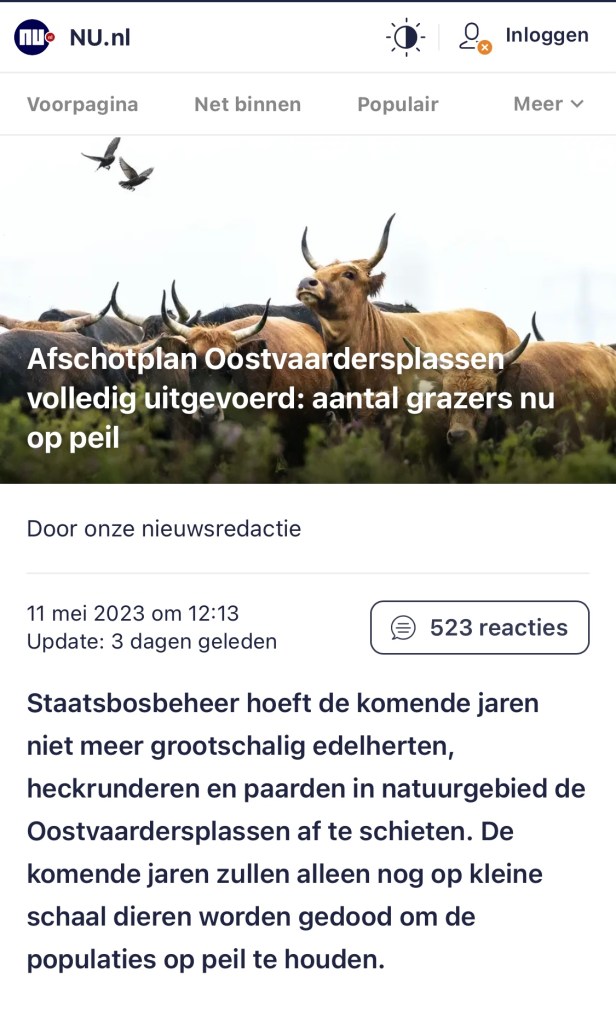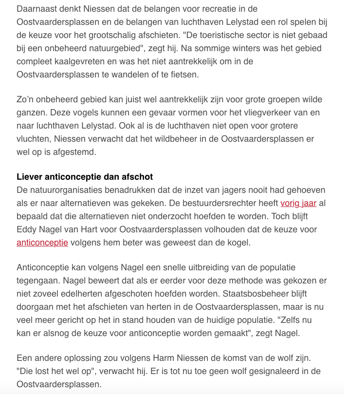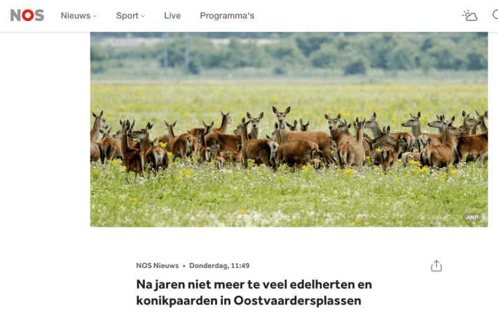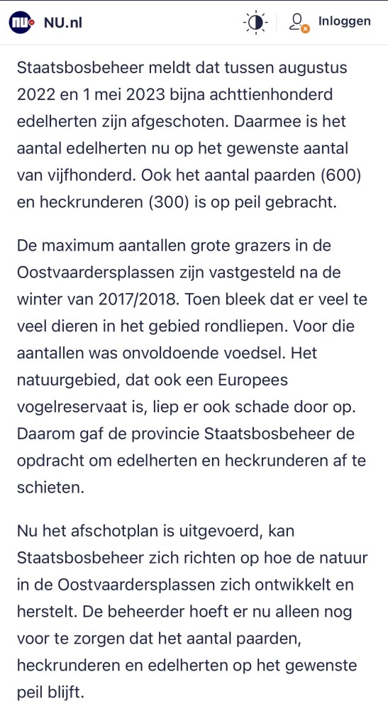 Dier – natuurgroepen verdiep of verdwijn . Inmiddels is de enige humane beheermethode anticonceptie, wel doorgesijpeld. Anticonceptie als oplossing wordt door Eddy Nagel van Stichting Hart voor Dieren genoemd. Al zegt natuurorganisatie Faunabescherming daar nog steeds niets over. Wij weten uit ervaring (andere landen gingen ons voor) dat deze stilte zal veranderen. Ook de nu nog stille dier en natuurgroepen zullen voor anticonceptie gaan pleiten. Doen ze dat niet, dan zal de burger met ze afrekenen. Want zeggen dat je voor dieren ben en voor de natuur opkomt wenst 3000 grazers te laten uihongeren ( ‘niets doen ‘ ) Naast dat je de overheid 4 maanden laat jagen – vangen – slachten – uithongerenvan van grote groepen grazers. Beide uitkomsten stroken niet met opkomen voor dier en natuur. Waar het nu op neerkomt voor dier en natuurgroepen het is ‘verdiepen of verdwijnen’.