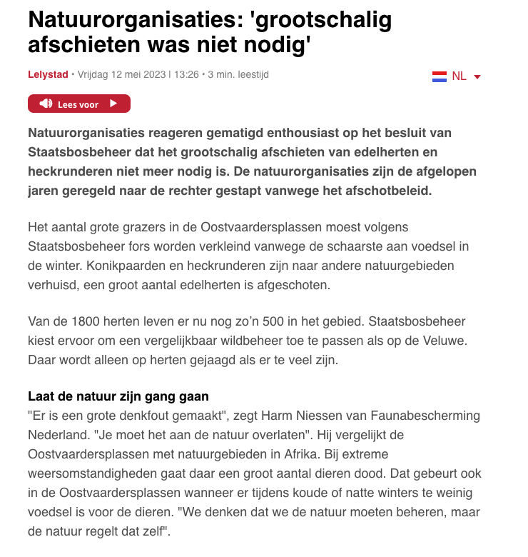 Provincie Flevoland heeft lak aan de participerende burger. Om een beetje oog te krijgen hoe de overheid te werk gaat hier het overzicht. De overheid koos voor de reductiemethode jaren ‘ niks doen’ ( niet ingrijpen). D.w.z in de tussentijd de populatie flink laten aangroeien. Met als gevolg dat men koos 3000 grazers langzaam te laten uithongeren. Na maanden honger kregen de grazers uiteindelijk een ‘genadeschot’. De overheid was verrast dat dit alles maatschappelijke onrust gaf ( 2017 ) De onrust werd gedempt door een belofte. Samen te zoeken naar humaan beleid. Die oproep kwam van de minister van Landbouw Carola Schouten en de provincie Flevoland. Zij gingen samen met de burger op zoek naar humaan beleid. Iedereen kon humaan beleid opperen. Meer dan dertig groepen kwamen er op af. Meer dan dertig groepen participeerde langer dan een jaar. Om te komen tot nieuw humaan beleid.Meer dan dertig groepen gaven aan dat de reductiemethode van de overheid : uithongering & doodschieten hen niet zinde. De werkgroep opperde de oplossing en de wetenschappers tijdens het participatietraject. De provincie Flevoland kon in dat traject de werkgroep en de wetenschappers flink zwart maken. Zo ontliep de provincie Flevoland haar wettelijke verplichting; het bevredigende alternatief dus humaan beheer. Dit omdat de provincie er alles aan kan doen om afschot, slacht en uithongering als reductiemethode te behouden. Geen handhaving, geen toezicht, geen inspanningsverplichting, geen rechten voor de participerende burger, zelfs beloftes in beleid en beloftes in afschotvergunningen kunnen ontlopen worden.
