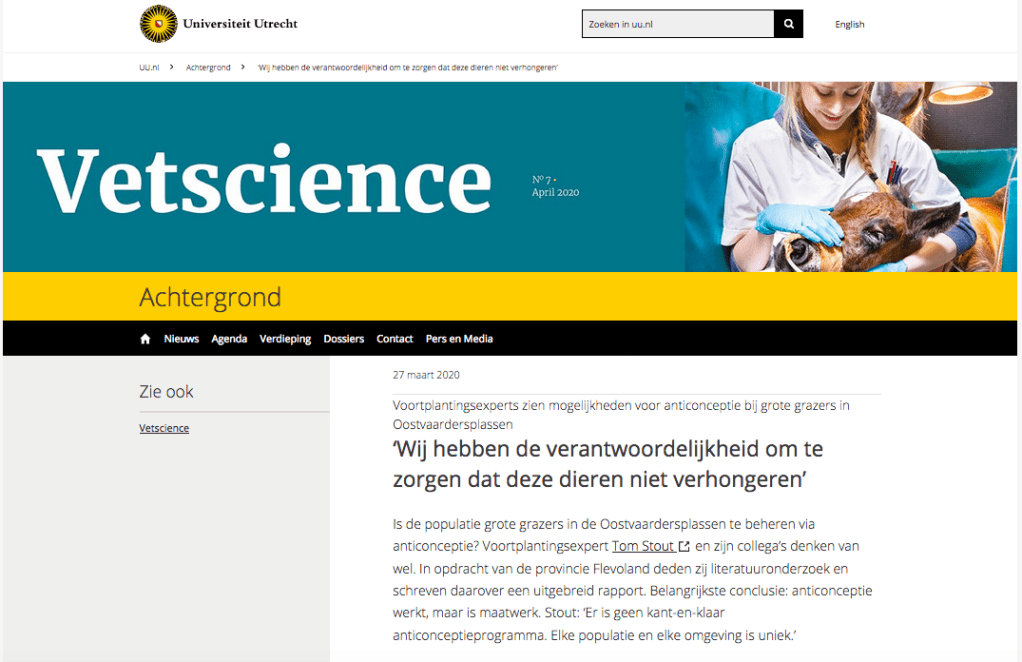 - Vetscience https://www.uu.nl/achtergrond/wij-hebben-de-verantwoordelijkheid-om-te-zorgen-dat-deze-dieren-niet-verhongeren. Universiteit Utrecht interviewt Professor Stout over de uitkomst van het rapport ” wereld literatuuronderzoek anticonceptie ” (5 maart 2020)